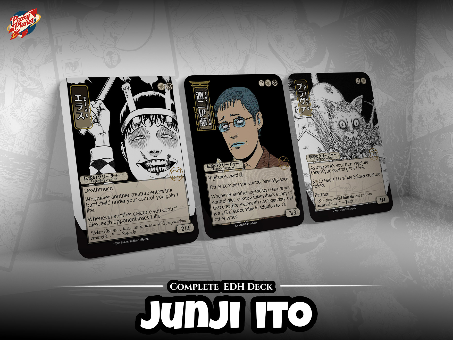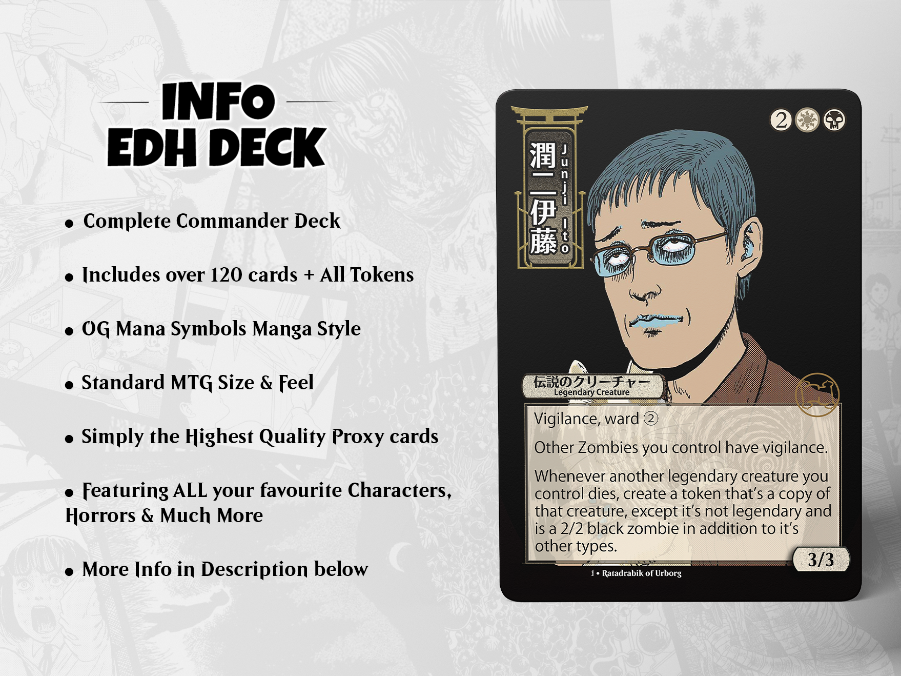 In this deck, you’re not just playing Magic — you’re stepping into the twisted, ink-drenched world of Junji Ito, where every turn draws you deeper into the grotesque.